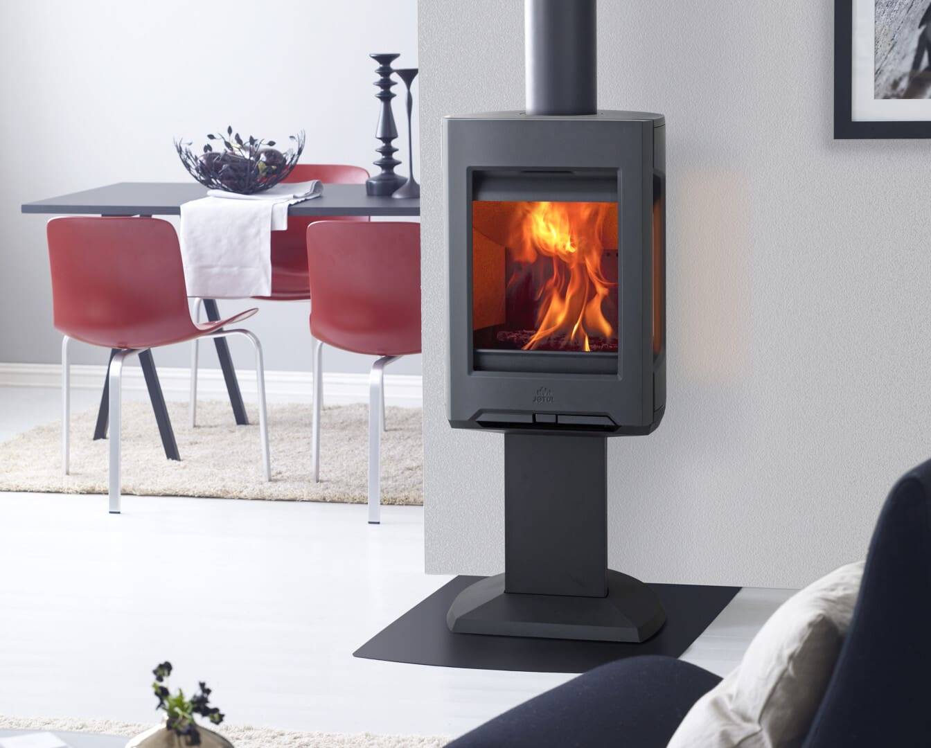 Jøtul F 163 is characterised by its large side glasses and three sturdy legs that give the wood stove an easy and modern look. There are also different finish options and you can choose either black paint or maintenance free white enamel.